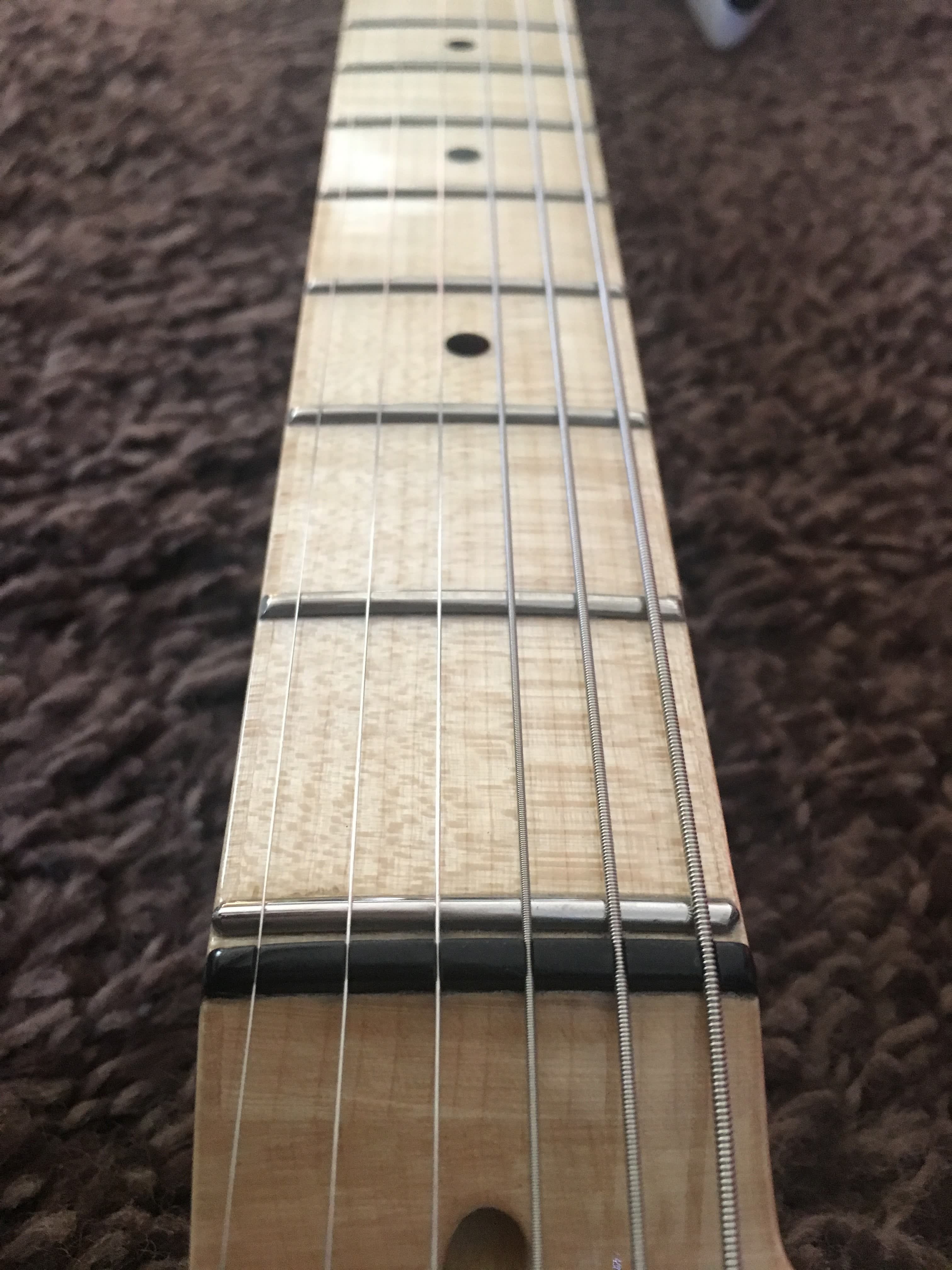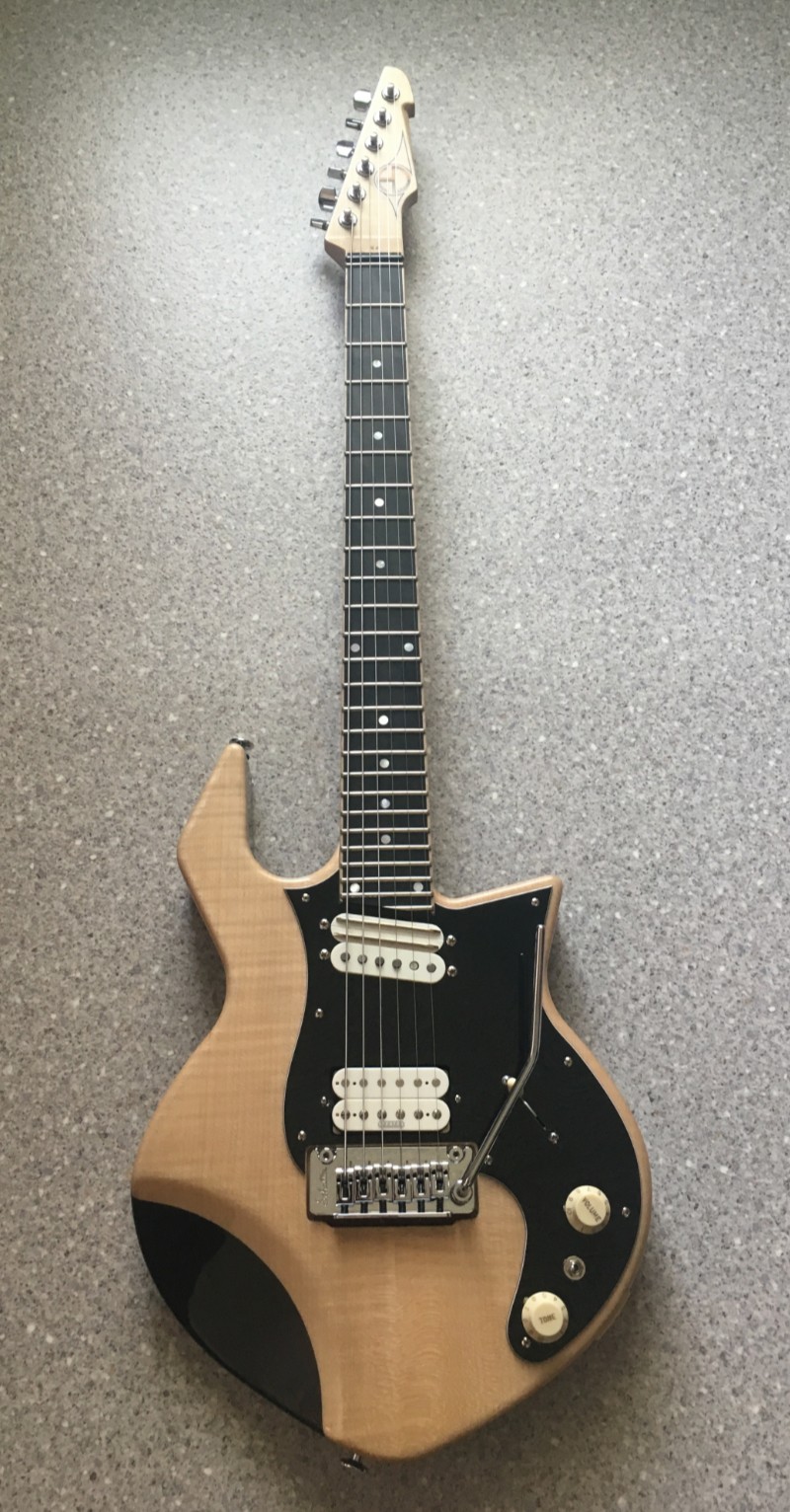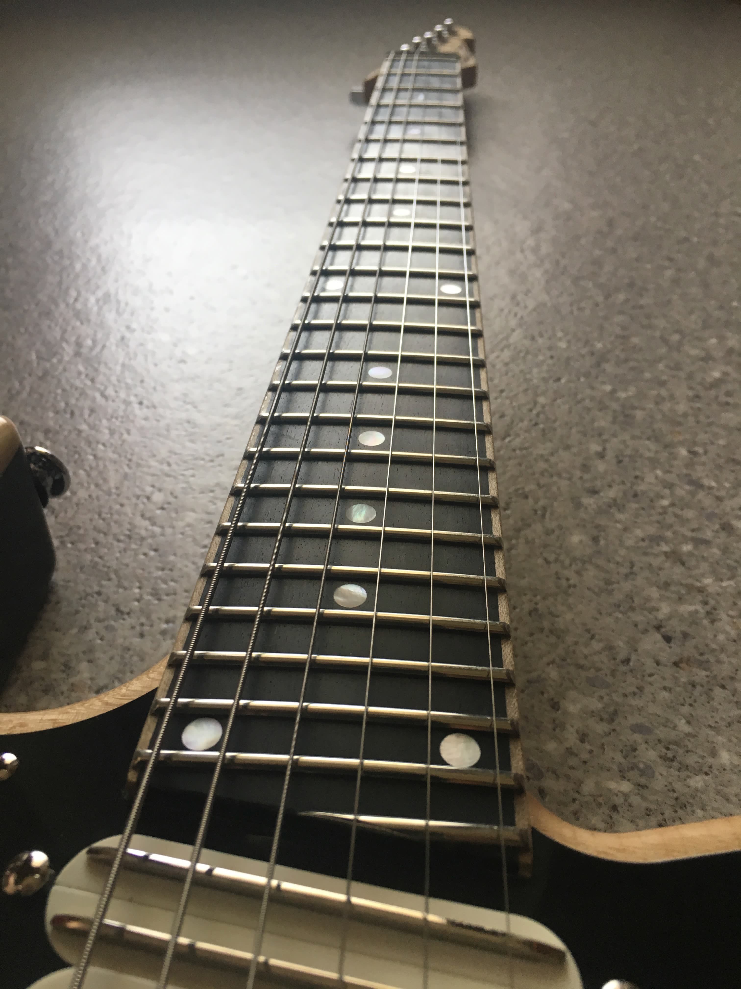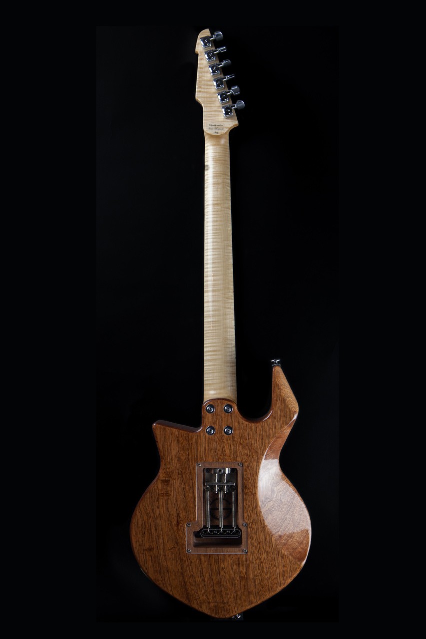 -Manico in acero marezzato, taglio di quarto , pezzo unico (43 mm di larghezza al capotasto ; 19,5 mm di spessore al primo fret e 21,5 mm al 12 esimo)-Scala 24,75” ( 628 mm)