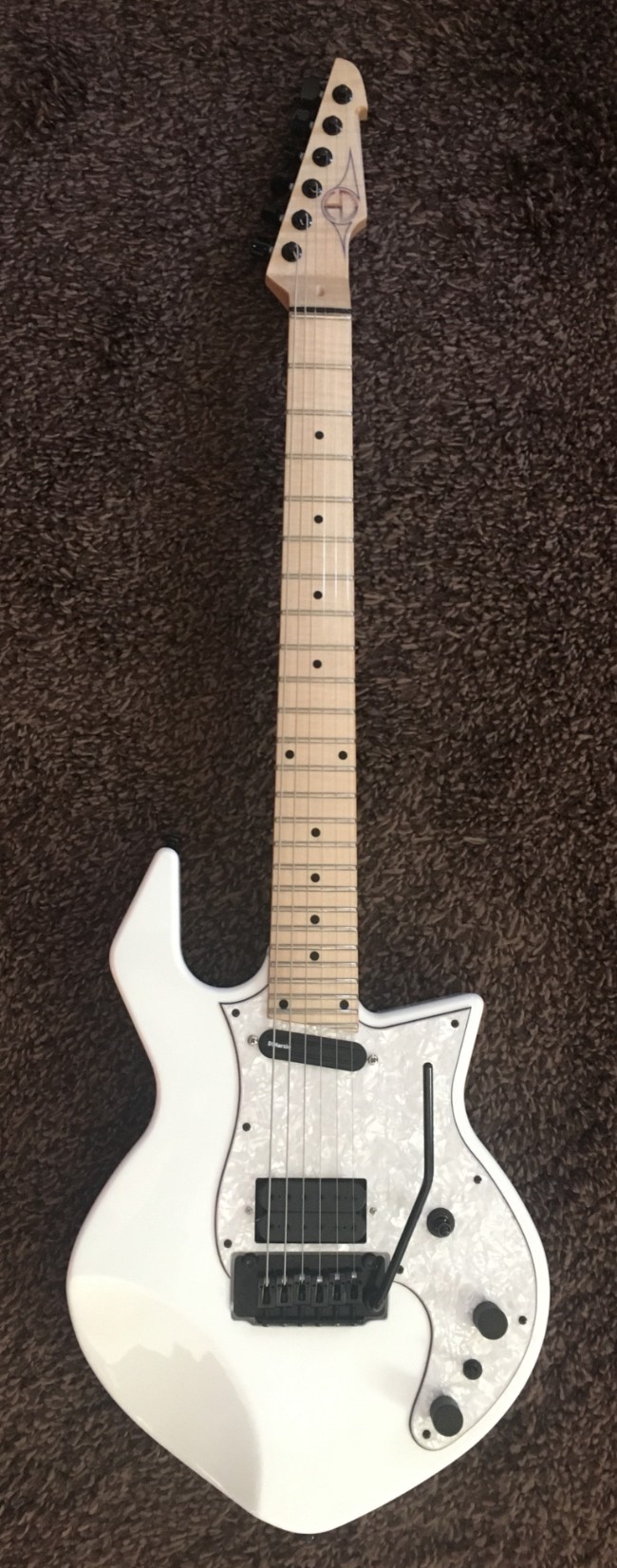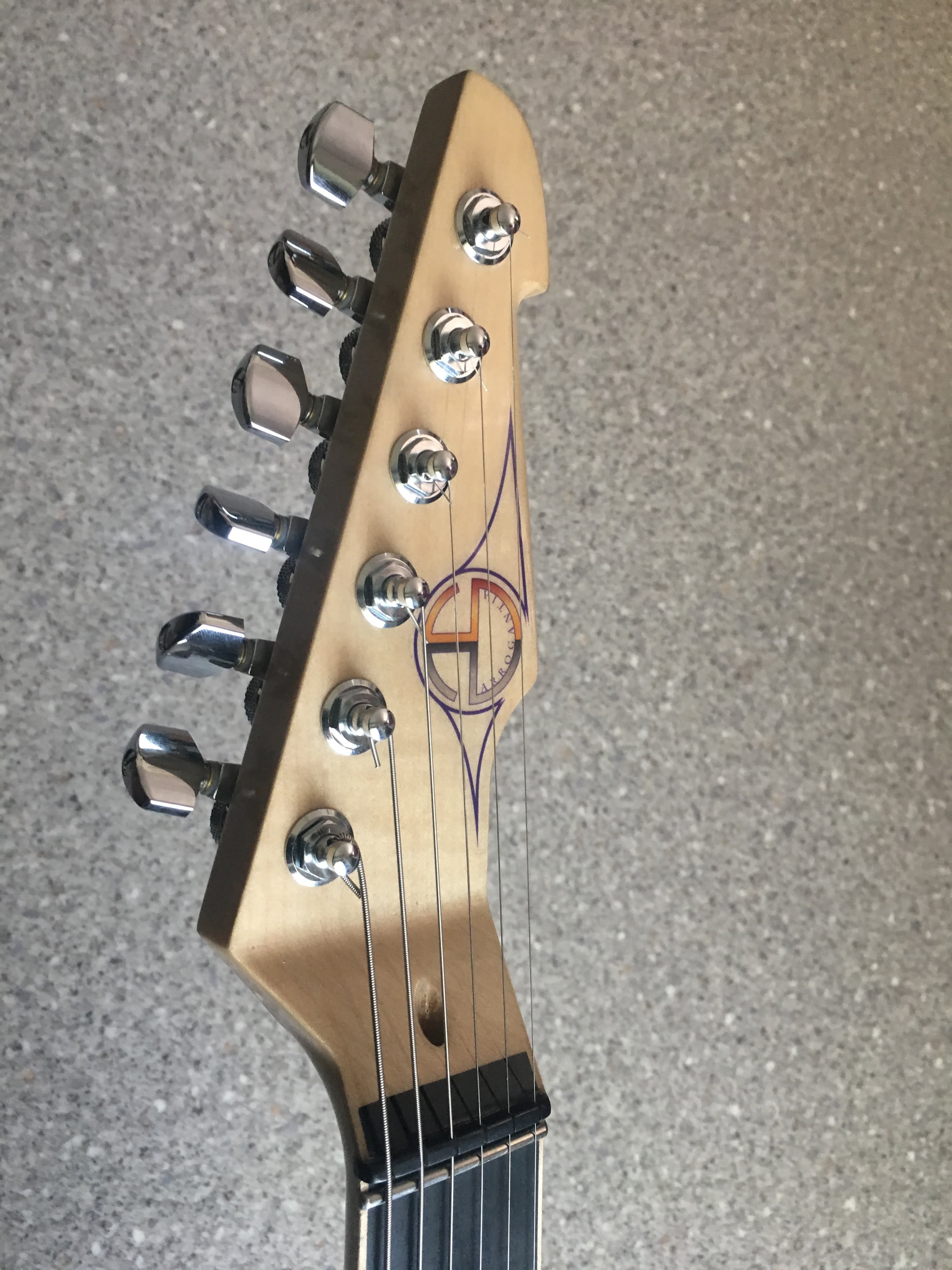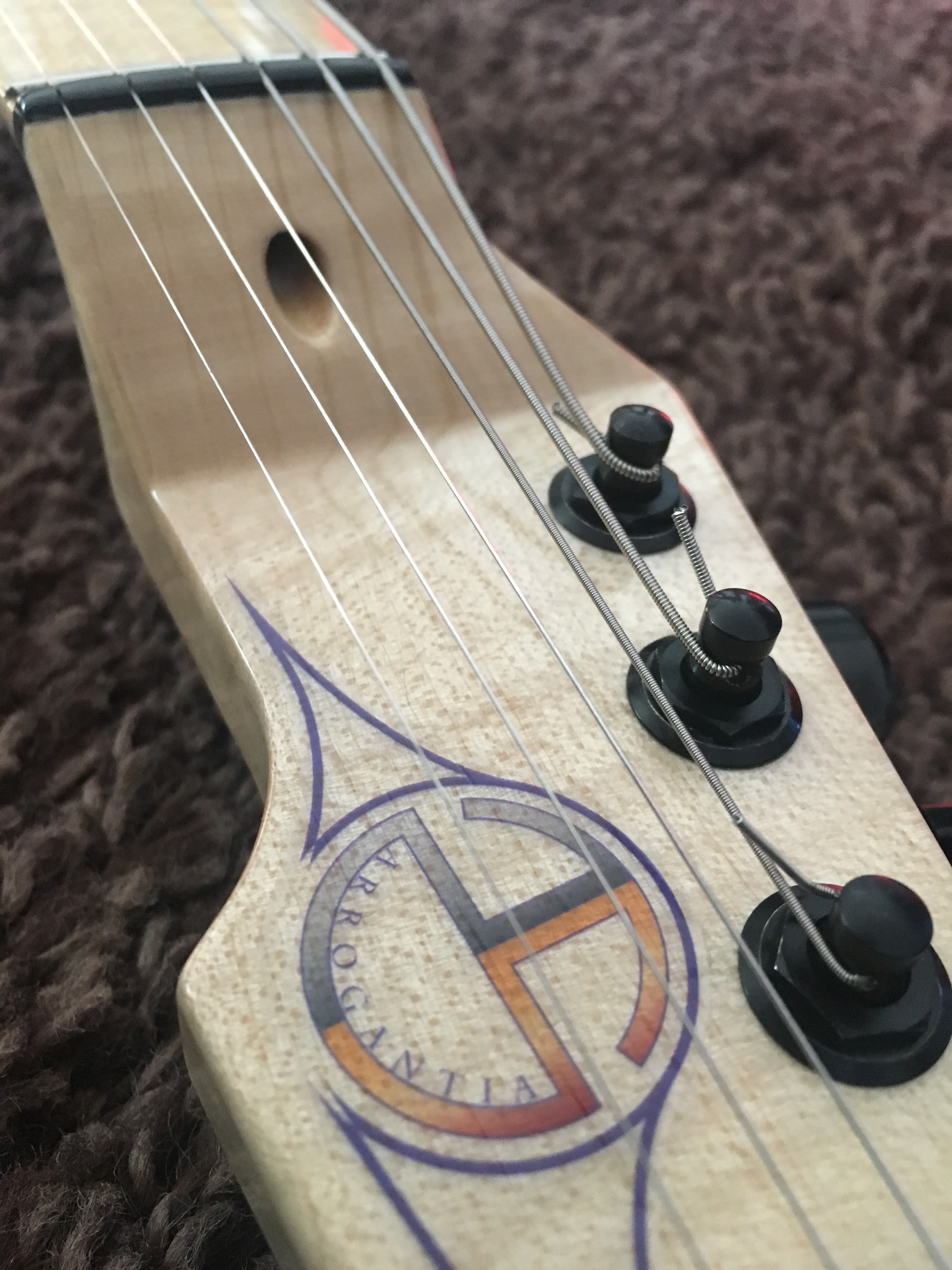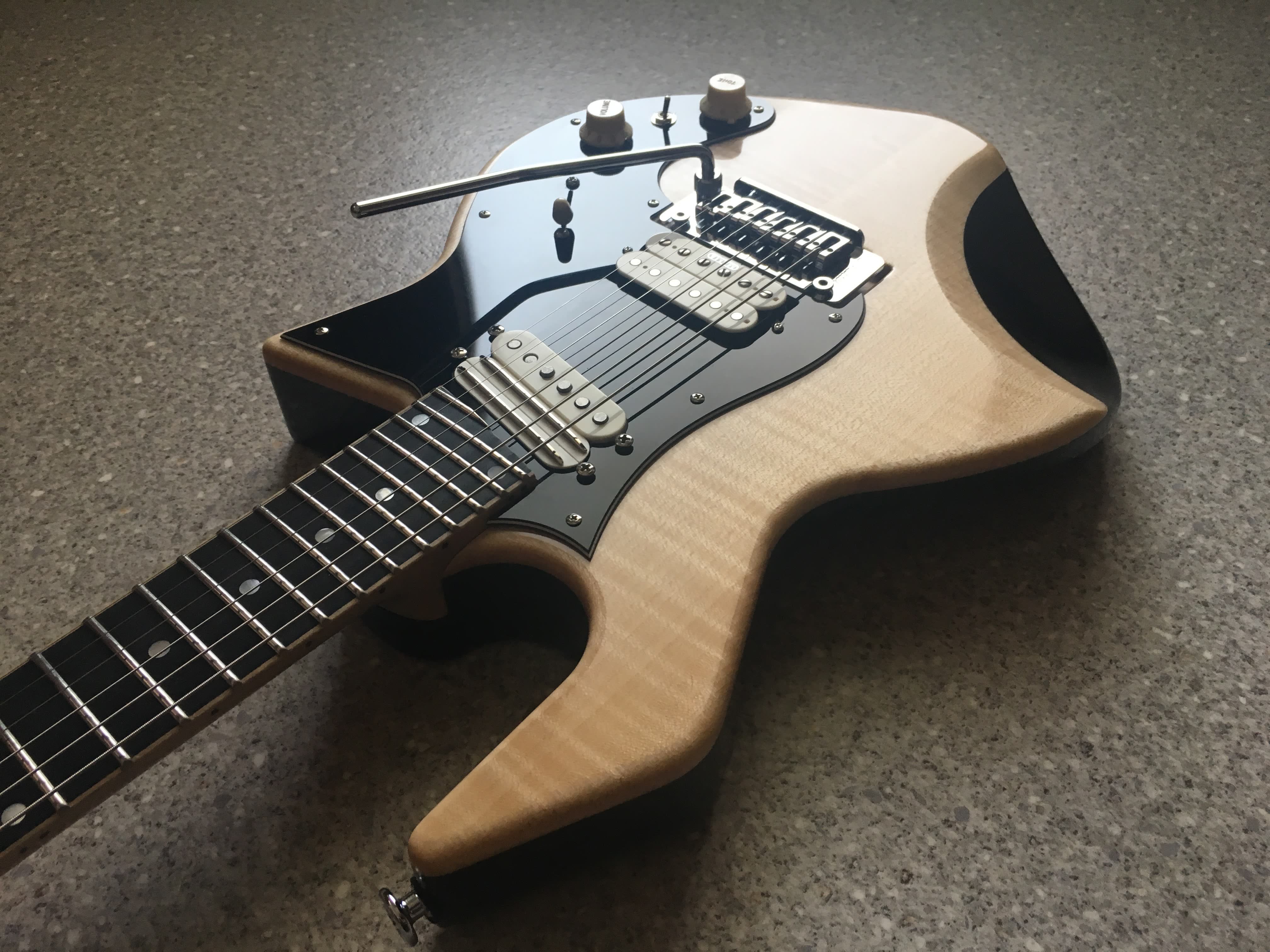 -Manico in acero marezzato, taglio di quarto , pezzo unico (43 mm di larghezza al capotasto ; 19,5 mm di spessore al primo fret e 21,5 mm al 12 esimo)-Scala 24,75” ( 628 mm)